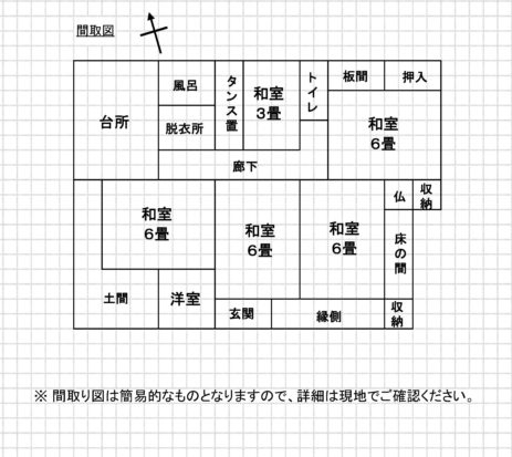 | その他 | 家財道具:無 駐車場:車庫有3台 家庭菜園:有(畑:505㎡) 倉庫納屋:有(車庫:72㎡+納屋:91.19㎡) 付随した農地:畑(505㎡)・・・農業委員会への3条許可申請が必要 ※農地含めた売却 |